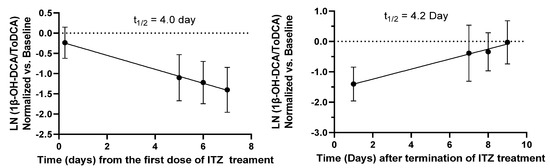 Based on the time course of 1β-OH-DCA/ToDCA following ITZ treatment, the half-life of urinary 1β-OH-DCA/ToDCA was estimated using the elimination curve following once-daily doses of ITZ and the recovery curve during the first washout period after the termination of ITZ treatment (Figure 3). Calculations of the elimination and the recovery rate using the existing data points resulted in a half-life of about four days.