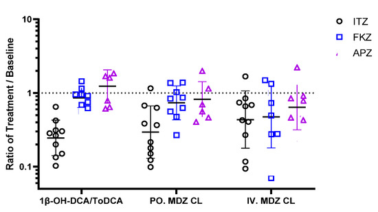 To test for statistically significant differences of the 1β-OH-DCA-based UMR before and after the treatment of ITZ/FKZ/APZ, the UMRs were log-transformed. The difference between log-transformed treatment/baseline was calculated pairwise for each subject, as well as for their 90% confidence intervals (CIs). These differences and CIs were anti-log-transformed back for reporting purposes. The same analysis was performed for MDZ clearance and AUC0-inf before and after treatment for comparison. Furthermore, the statistically significant differences of the two markers, i.e., 1β-OH-DCA/ToDCA, UMR, and MDZ clearance, to reflect CYP3A activity were also analysed. The difference between the log-transformation of 1β-OH-DCA-based UMRTreatment/UMRBaseline and MDZ-based CLTreatment/CLBaseline were calculated. The mean differences and 90% CIs for the differences were exponentiated to provide point estimates of the ratio of geometric means (1β-OH-DCA/ToDCA UMR: MDZ CL) and 90% CIs for the ratios.