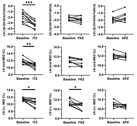 Individual urinary 1β-OH-DCA/ToDCA UMR (upper panel), oral (middle panel), and i.v. (bottom panel) MDZ clearance (L/h) at baseline and after the repeated administration of ITZ (100 mg od for 6 days), FKZ (50 mg od for 14 days), and APZ (1 mg od for 9 days). * p < 0.05; ** p < 0.01; *** p < 0.001.