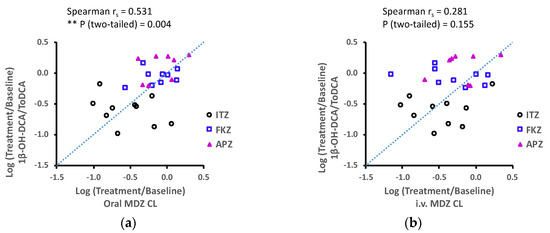 Spearman correlation between changes of the urinary metabolic ratio of 1β-OH-DCA/ToDCA and orally (a) and i.v. (b) administered MDZ clearance before (baseline) and after the repeated administration of ITZ (100 mg od for 6 days), FKZ (50 mg od for 14 days), and APZ (1 mg od for 9 days).