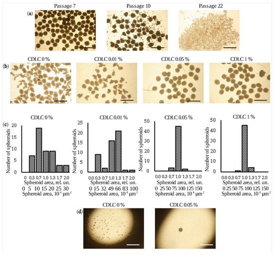 We have previously shown that using hanging drops is a practical method to form spheroids from eMSCs [13,14]. However, in this work, while studying the possibility of increasing the yield of spheroids and testing cell lines obtained from different donors, we faced the problem of obtaining spheroids that varied in size. We found that, sometimes, not all cells in one droplet aggregate together, but several smaller spheroids can be formed. Furthermore, it was also observed that the ability of eMSCs to form spheroids depended on the donor and dropped with the cell culture passage (Figure 1a). This circumstance makes it necessary to select the cell lines most suitable for the formation of spheroids, which prevents the use of autologous cells in the clinical use of spheroids. To overcome the emerging problems, we set a goal to modify the composition of the culture medium applied in the process of spheroid formation in order to increase their yield and quality. We found that the addition of chemically defined lipid concentrate (CDLC) to the culture medium to create spheroids promoted the aggregation of all cells in the droplet and resulted in the formation of uniformly sized spheroids. CDLC is a lipid emulsion added to serum-free media for the cultivation of various cell lines. We analyzed the size of the forming spheroids using different concentrations of CDLC. It was estimated that the addition of 0.01% CDLC to the growth medium increased the yield and average size of spheroids but did not reduce their size variability. The 0.05% CDLC resulted in enhanced yield, spheroid enlargement and decreased size variability (Figure 1b,c). A further increase in the concentration of CDLC to 1% did not exert an additional effect. The efficiency of 0.05% CDLC was tested on five eMSC lines from different donors, including donors with a reduced ability to form spheroids, as well as on eMSCs at various passages (passage 5, passage 10, passage 22). In all cases, the use of the culture medium modified by CDLC reduced the size variability of forming spheroids (Figure S1c). It was also found that when CDLC was added, only one spheroid was formed from all cells in the droplet (Figure 1d). A similar effect of the CDLC-modified medium on spheroid formation was registered for MSCs obtained from bone marrow and adipose tissue (Figure S1a,b).