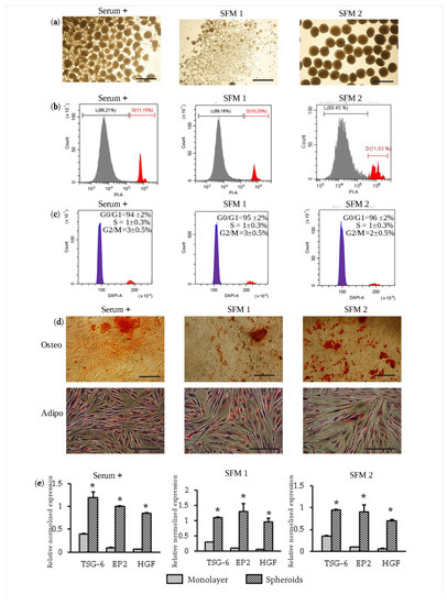 Viability, multipotency, cell cycle distribution and gene expression of eMSC spheroids under serum-free conditions. (a) Aggregation of eMSCs into spheroids cultured in serum-containing medium (Serum+), SFM 1 or SFM 2 (scale bar, 300 μm.); (b) viability of eMSCs in spheroids cultured in serum-containing medium (Serum+), SFM 1 or SFM 2; L—live cells, D—dead cells; (c) representative cell cycle distribution of eMSCs in spheroids cultured in serum-containing medium (Serum+), SFM 1 or SFM 2. (d) Osteogenic and adipogenic differentiation of eMSCs in spheroids cultured in serum-containing medium (Serum+), SFM 1 or SFM 2 (scale bar, 200 μm). (e) q-RT-PCR assay of TSG6, EP2 and HSF genes in eMSC spheroids and monolayer cells under serum-free conditions. Data are shown as mean ± SD (n = 3). Two-tailed Student’s t-test was utilized for pairwise comparison. * p < 0.01 vs. eMSCs in monolayer.