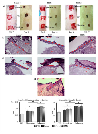 We have previously demonstrated that transplantation of eMSCs in spheroids improved wound healing in rats [14]. To assess the therapeutic potential of eMSCs in spheroids organized in a serum-free medium, we also used a wound healing model. To form wounds in rats, skin flaps on the back were removed. The transplantation of eMSC spheroids formed in the serum-free medium was performed by their injections along the edge of the wound. The effect of transplantation was compared to one produced by the spheroids formed in the FBS-supplemented medium. In each spheroid group, PBS solution and eMSCs cultured in monolayer at the same conditions were used as controls. We observed that transplantation of eMSCs in spheroids accelerated wound healing (Figure 3a). On day 10, in animals transplanted with eMSC spheroids cultured in both serum-free media, the wound area was almost completely covered with a new epithelium compared with the wound closure after transplantation of cells cultured in monolayer at the same conditions or injection of PBS solution (Figure S3b). The average time of wound closure for eMSC transplantation in spheroids was 12 days compared with the administration of PBS solution (15 days) (Figure S3a). Examination of histological sections revealed an increased length of the newly formed regenerating epithelium in wounds after transplantation of eMSC spheroids, compared with monolayer eMSC transplantation or injection of PBS solution (Figure 3b–d). Measurements of the thickness of granulation tissue also showed improved regeneration after transplantation of eMSCs in spheroids (Figure 3e). In conclusion, we have shown that transplantation of eMSC spheroids generated in serum-free media stimulated wound healing in rats more efficiently than transplantation of eMSCs grown as a monolayer culture. The method we applied for the generation of uniform-sized spheroids in media that do not contain components of animal origin looks promising for clinical use.