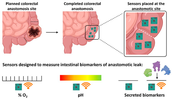 The intra-operative use of Clark O2 electrodes, as previously described, has been investigated for their ability to predict AL. However, these studies overlooked their applications for post-operative use. The concept of using miniaturised Clark O2 sensors to provide post-operative intestinal ptO2 measurements has begun to be investigated by the Implantable Microsystems for Personalised Anti-Cancer Therapy (IMPACT) programme. Our group has developed novel implantable miniaturised Clark-type electrochemical O2 sensors [157] and methylene blue-based electrochemical and ion sensitive field-effect transistor (ISFET) pH sensors [158]. The idea that these sensors could be placed intra-operatively around the anastomotic site and be left in situ would allow clinicians to continuously monitor peri-anastomotic intestinal ptO2 and pH throughout the post-operative recovery period. This type of continuous monitoring system would help to identify patients at risk of developing an AL due to poor or deteriorating peri-anastomotic intestinal ptO2. It would also allow clinicians the ability to assess the efficacy of interventions designed to improve intestinal ptO2 and prevent a leak from occurring. The electrochemical O2 sensor has undergone initial in vivo validation in a rat model [159]. The results from this study showed that sensors, placed on intestinal serosal surfaces, were able to provide continuous, real-time ptO2 readings. These sensors also recognised and reported dynamic intestinal ptO2 changes that occurred with hypoxaemic and ischaemic challenges. The authors suggested that although further research is required, this pre-clinical study demonstrated the potential use of miniaturised implantable medical devices for intestinal surgery.