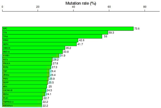 COAD reveals a specific gene expression pattern. Gene expression analysis was done using TCOA public database, revealing 1628 altered genes (363 overexpressed and 1265 downregulated genes), selecting a cut-off value |Fold change| >2 and FDR q-value ≤ 0.05 (Table 1). Additionally, the top 20 most frequent mutations are displayed in Figure 1.