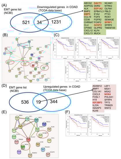 Common EMT downregulated and upregulated gene expression signature in COAD. (A) Venn diagram used to shows the common signature among the EMT gene list (downloaded from NCBI) and the downregulated genes in COAD, red letters—genes predict overall survival; (B) interaction network using String software for 34 downregulated genes common with EMT mechanisms, red circles—genes that predict overall survival outcomes; (C) COAD downregulated genes involved in EMT (DACT3, EEF1A2, BMP5, GCNT2 and SFRP1) predicting overall survival; (D) Venn diagram used to show the common signature among the EMT gene list (downloaded from NCBI) and the upregulated genes in COAD, red letters—genes predict overall survival; (E) interaction network using String software for 19 overexpressed genes common with EMT mechanisms, red circles—genes predict overall survival outcomes; (F) COAD overexpressed genes involved in EMT (NOX4 and IGF2BP3) predicting overall survival.