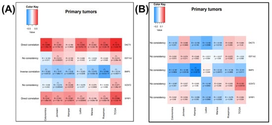 Correlation among the EMT gene signature. CANCERTOOL is a friendly web-based interface that allows us to carry out gene-to-gene correlations in multiple datasets at the same time for a specific cancer subtype, including for COAD [32]. Additionally, it permits us to perform correlations among the altered genes and gene enrichment analysis. The correlation heatmap was performed based on five Affimetrix datasets (GSE44076, GSE14333, GSE33113, GSE37892, GSE39582), one Agilent dataset (GSE42284) and one RNAseq dataset. An additional correlation among the expression level of BMP5 and its related directly and indirectly interconnected miRNAs was done using the miRNA-Target CoExpression tool from StarBase (http://starbase.sysu.edu.cn/index.php, accessed on 22 April 2021) [30].