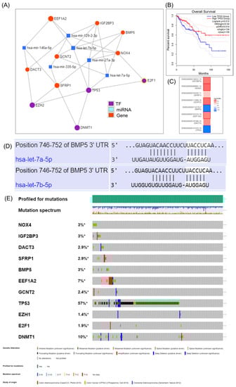 The target gene–miRNA interaction in COAD as revealed by the use of miRNET miRNA target gene online tool. (A) Interconnection between the EMT genes, key transcription factors and miRNA, generated using miRNET; (B) TP53 predicts overall survival rate in COAD; (C) survival map generated using GEPIA online tool; (D) prediction of has-let-7a-5p and let-7b-5p binding to BMP5 3′UTRs, generated using TargetScan 3.0 (http://www.targetscan.org/mamm_30/docs/help.html, accessed on 22 April 2021); (E) analysis of genetic alterations in COAD using cBioPortal data; online plot presents the mutation frequency for the selected genes found in RNAseq data. * Not Appliable.