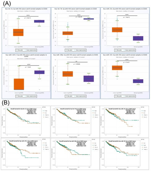 The expression level and survival analysis of miRNAs targeting key EMT genes in COAD with StarBase. (A) Expression levels in COAD of let-7a-5p, let-7b-5p, miR-27a-3p, miR-129-2-3p, miR-146a-5p and miR-335-3p based on StarBase; (B) Kaplan–Mayer plot in COAD for let-7a-5p, let-7b-5p, miR-27a-3p, miR-129-2-3p, miR-146a-5p and miR-335-3p based on StarBase. ns p > 0.05; ** p ≤ 0.01; **** p ≤ 0.0001.