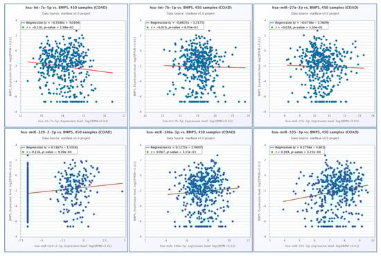 Correlation among the expression levels BMP5 and let-7a-5p, let-7b-5p, miR-27a-3p, miR-129-2-3p, miR-146a-5p and miR-335-3p in COAD, generated using StarBase.