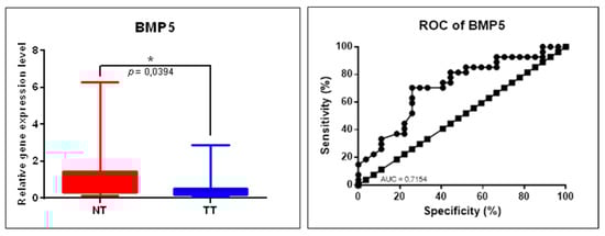 BMP5 gene expression alteration in COAD evaluated by qRT-PCR. Scatter plots demonstrate the downregulation of BMP5 in tumor tissues (TT, n = 29) versus normal tissues (TN, n = 29), B2M was used as a housekeeping gene (* p ≤ 0.05); ROC curves for each selected gene’s specificity and sensitivity (NT: normal tissue, TT: tumoral tissue, ROC: receiver-operating characteristic, AUC: area under ROC curve).