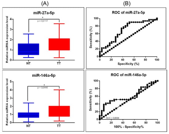 miRNA targeting key EMT signaling genes in COAD. (A) Scatter plots demonstrate the upregulation of miR-27a-5p and downregulation of miR-146a-5p in tumor tissues versus normal adjacent tissues; U6 and RNU48 were used as normalizations (* p ≤ 0.05); (B) ROC curve for miR-27a-5p and miR-146a-5p (NT: normal tissue, TT: tumoral tissue, ROC: receiver-operating characteristic, AUC: area under the curve).