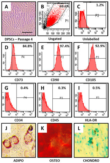 Characterization of DPSCs for mesenchymal stem cell (MSC) markers and trilineage differentiation. (A) Photomicrograph of DPSCs at passage 4. (B–I) DPSCs were checked for MSC-specific positive markers CD73, CD90, and CD105; and MSC-specific negative markers CD34, CD45, and HLA-DR. (J–L) DPSCs were differentiated into adipocytes, osteoblasts, and chondrocytes. Scale bar = 100 μm. DPSCs: dental pulp stem cells, ADIPO: adipogenic differentiation, OSTEO: osteogenic differentiation, CHONDRO: chondrogenic differentiation.