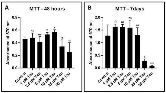 MTT assay to assess the cytotoxicity of taurine to DPSCs. (A,B) DPSCs were treated with various concentrations of taurine (1 μM, 2.5 μM, 5 μM, 10 μM, 25 μM, and 50 μM) for 48 h and seven days and comparative analysis was done to check the cytotoxicity of taurine to DPSCs. ns: not significant, * p < 0.05, ** p < 0.01. Tau: Taurine.