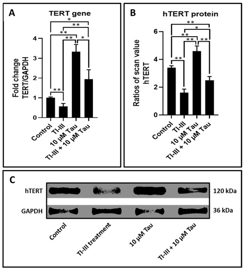 DPSCs were seeded into 12-well plates at the cell density of 1 × 105 cells per well and incubated for 24 h. For hTERT protein expression analysis, four experimental groups were created: the control, TI-III, 10 μM Tau, and TI-III + 10 μM Tau. Cultures were incubated for seven days at 37 °C in a 5% CO2 incubator; the medium was replaced with a fresh medium twice. The cells were lysed using RIPA buffer (Sigma Aldrich, St. Louis, MO, USA) and the lysates were centrifuged at 12,000 rpm for 15 min. The supernatant was collected, and the protein content was determined using the protein assay. SDS-PAGE sample buffer was introduced to the lysates and the lysates were heated to 100 °C for 8 min. Of the total protein, 20 μg was loaded in each well of a 10% SDS-PAGE gel on Mini-PROTEAN Tetra Cell (Bio-Rad Laboratories Inc., Hercules, CA, USA). Western blot technique was performed by using hTERT antibody and GAPDH antibody (Abcam, Cambridge, UK) as primary antibodies and HRP-conjugated secondary were used for the detection of proteins of interest.