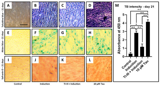 Chondrogenic differentiation of DPSCs and quantification of toluidine blue intensity. Chondrogenic differentiation was induced in DPSCs with and without treatment with telomerase inhibitor and DPSCs treated with taurine alone were assessed for chondrogenesis. Functional staining was done with (A–D) toluidine blue, (E–H) Alcian blue, and (I–L) safranin O. Scale bar = 100 μm, (M) Comparative quantification of toluidine blue intensity day 21. * p < 0.05, ** p < 0.01. Induction: Chondrogenic differentiation, Tau: Taurine, TI-III: Telomerase Inhibitor III, TB: Toluidine blue.