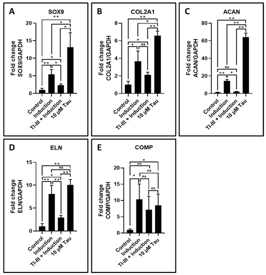 Chondrogenic differentiation of DPSCs and the analysis of chondrogenesis related gene expression by quantitative RT-qPCR. (A–E) Comparative gene expression analysis of chondrogenesis-related genes SOX9, COL2A1, ACAN, ELN, and COMP in chondrogenesis induced DPSCs with and without treatment with telomerase inhibitor and DPSCs treated with taurine alone. ns: not significant, * p < 0.05, ** p < 0.01. Induction: chondrogenic differentiation, Tau: taurine, TI-III: telomerase Inhibitor III, SOX9: SRY-box transcription factor 9, COL2A1: collagen, type II, alpha 1, ACAN: aggrecan, ELN: elastin, COMP: cartilage oligomeric matrix protein.