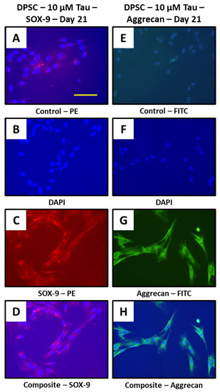 Chondrogenesis related proteins SOX-9 and aggrecan were assessed in 10 μM taurine treated DPSCs at day 21. Both proteins showed expression by immunostaining (Figure 6A–H).