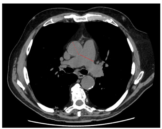 Radiologists with 7 to 32 years of experience blindly reviewed CT images from their own institution, assessing lung parenchyma and the presence of pleural effusion and mediastinum lymph nodes with short-axis diameters larger than 1 cm [43]. Lung parenchymal involvement was qualitatively assessed by radiologists on their own institutional digital imaging and communications in medicine (DICOM) viewer, considering the presence of parenchymal involvement signs, (i.e., ground-glass opacities (GGOs), consolidations, and crazy paving pattern) and the volumetric extent of parenchymal involvement, assessed according to Chung et al. [21]: 0% (absent, 0); 1–25% (minimal, 1); 26–50% (mild, 2); 51–75% (moderate, 3); and over 75% (severe, 4). As described by Wells et al. [44], PA and AA maximum diameters were measured on a single axial slice selected at the level of pulmonary arterial main trunk bifurcation (Figure 1).