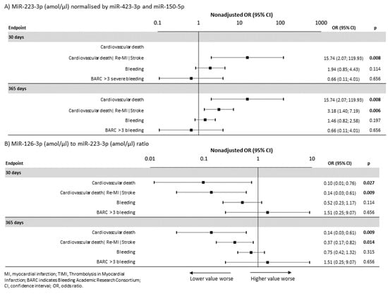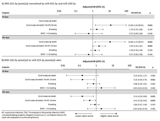 In summary, our study proved that MiR-223-3p values and the miR-126-3p to miR-223-3p ratio are promising predictors of short- and long-term thrombotic events and can be used for ischemic risk stratification of patients after AMI.