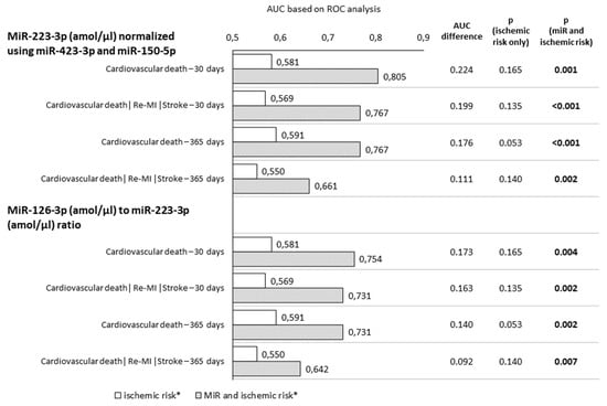MiR-223-3p (amol/µL) and the miR-126-3p to miR-223-3p ratio and ischemic risk calculation. Adding of either miR-223-3p or miR-126-3p to miR-223-3p ratios into the model for calculating ischemic risk resulted in an increased prediction. ROC, receiver operating characteristic; AUC, area under the ROC curve. * Ischemic risk calculation according to the presence of clinical characteristics: Age > 65 years, DM, renal failure, lower limb ischemia, MI in anamnesis, multiple vessels disease, suboptimal/unsuccessful PCI.