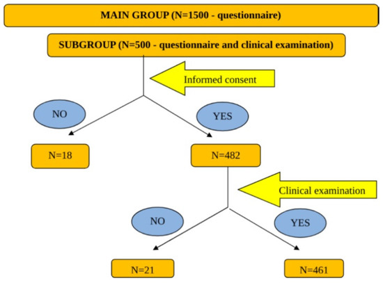 Selected subjects were asked to give their consent for the examination. From the 500 selected subjects, 18 did not agree to participate to the clinical examination and another 21 agreed, but did not show up at the dermatologist. The study algorithm is shown in Figure 1.