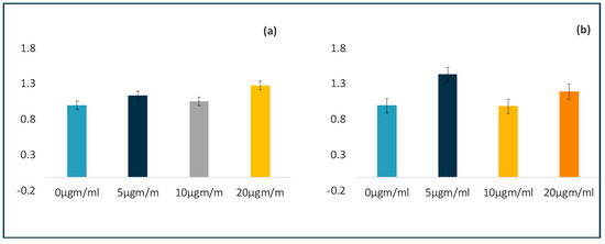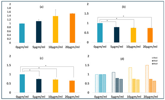 The mean cell proliferation rates of the PDLSCs treated with LPS were compared to their controls using an ANOVA analysis. At 24 h, LPS increased the proliferation of the PDLSCs at all three concentrations (5, 10, and 20 µgm/mL) when compared to the untreated cells. However, this increase was not statistically significant. Interestingly, at 48 h and 72 h, LPS decreased the proliferation of PDLSCSs when compared to untreated cells. This decrease was statistically significant (p ≤ 0.01). The post hoc Tukey test revealed significant differences between all three concentrations (p ≤ 0.05) at 48 h except between 10 µgm/mL and 20 µgm/mL. However, at 72 h, significant differences between 0 µgm/mL and 5, 10, and 20 µgm/mL were observed but not between 5 µgm/mL 10, and 20 µgm/mL and between 10 µgm/mL and 20 µgm/mL. (Figure 1 depicts the proliferation rates of PDLSC’s with LPS treatment).