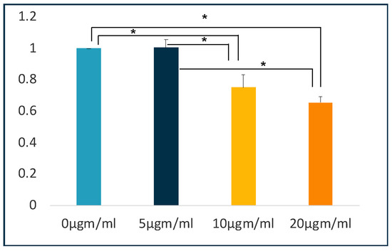 A decreasing amount of calcium production was observed when comparing the mean Alizarin-Red stain content following treatment of cells with different concentrations of LPS treated groups with the control group. The ANOVA analysis showed significant differences between the groups (p-value 0.005). The post hoc Tukey analysis showed significant differences between 0 µgm/mL and 10, and 20 µgm/mL (p ≤ 0.05) but not between 0 and 5 µgm/mL and ten and 20 µgm/mL (p > 0.05). Figure 2 shows the comparison of Alizarin-Red between different groups.