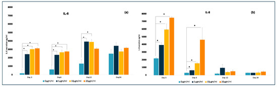 Effects of LPS on cytokine secretion profile of 3D PDLSCS. Cells were cultured under osteogenic induction and with LPS at different concentrations for different time intervals. Graphical representation of (a) IL-6 and (b) IL-8 secretion by 3D PDLSCs. The values of three independent experiments are presented as means ± SD. * p ≤ 0.05.