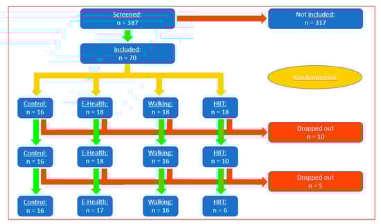 A total of 387 patients were screened for the possibility of participating; 317 did not fulfil the criteria, and 70 were randomized. Sixteen patients were assigned to the control group and 18 to each of the intervention groups. Ten patients withdrew for unrelated or medical reasons after randomization in the other group, and five had to be excluded for technical reasons. In the E-health group, 18 patients started, one dropped out. Finally, the data of 17 patients from the E-health group were evaluated. 18 patients were randomized into the walking group, 16 started with walking, and all 16 were evaluated. All 16 randomized patients to the control group were evaluated. Eighteen patients were randomized to the high-intensity interval training (HIIT) group, ten (10) started with the study, but only 6 finalized the course of 12 weeks. The HIIT group had to be dissolved because too many patients dropped out (Figure 1).