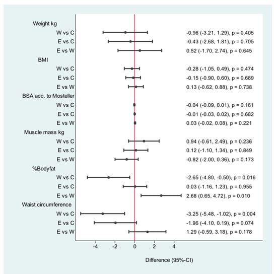 The walking group was more successful in reducing the waist circumference (−3 cm, CI: −4.41–1.59) p < 0.001) and in reducing body fat (−2.74%/CI: −4.71, −0.76/p < 0.007) than the control group and the pedometer group (Figure 2). The heart rate at rest changed significantly (6.50 p/min/CI: −9.69, −3.3/<0.001). The pedometer group was more effective in reducing waist circumference than the control group (−1, 71 cm, CI: 3.00–041, p < 0.010) (Figure 3).