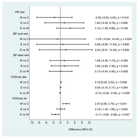 Differences after the intervention; HR = heart rate, BP = blood pressure, VO2 max abs = oxygen uptake max, VO2 max rel = oxygen uptake in relation to weight. W = walking, C = control, E = E-health (pedometer).