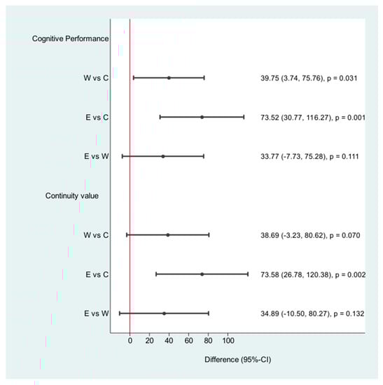 Cognitive performance improved significantly (participants thought faster) in both physically active groups (walking 51.87 (27.13, 76.62) (p < 0.001) and the E-health group (85.65 (52.04, 119.26) (p < 0.001)). We summarized the results in Table 2.