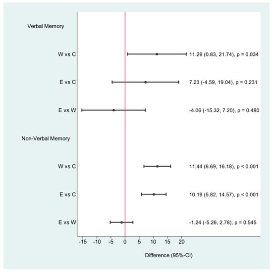 Verbal and nonverbal memory: differences after the intervention; W = walking, C = control, E = E-health.