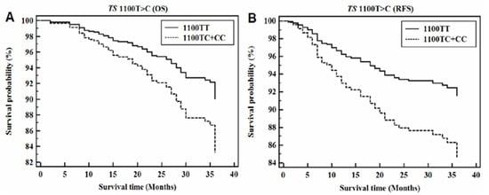 Cox proportional-hazard regression analysis for TS 1100T>C. (A) Overall survival (OS) curve for TS 1100T>C (Dominant model; AHR = 1.82; 95% CI = 1.07–3.08; p = 0.027). (B) Relapse-free survival (RFS) curve for TS 1100T>C (Dominant model; AHR = 2.00; 95% CI = 1.19–3.35; p = 0.009).