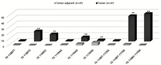 Expression of thymidylate synthase (TS) 1100T>C (rs699517) and 1170A>G(rs2790). Single nucleotide polymorphisms (rs699517 and rs2790) in the 3′-untranslated region (UTR) of TS. Quantitative reverse transcription PCR (qRT-PCR) to measure levels of TS 1100T and 1100C, TS 1170A and TS 1170G, TS 1100T-1170G and TS 1100C-1170A expression in CRC tissue. Means and individual values from three biological replicates are shown. Source data are provided in the source Supplemental Table S5. The housekeeping gene GADPH served as the loading control. ** indicates p < 0.05.