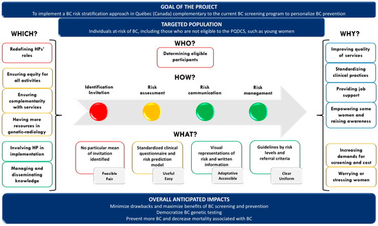 The recent evolution of genomic technologies and research has led to the discovery of diverse genetic variants associated with BC risk. These may confer high or moderate risks of developing BC. Alternatively, some polymorphisms (SNPs) may confer a low although clinically relevant risk when combined into a polygenic risk score [1,2]. The idea of adapting the current BC screening programs on the basis of different personalized risk levels emerged from these discoveries. Called BC risk stratification, such a service is viewed as a step toward the ultimate objective of personalized medicine by incorporating genomic innovations and tailoring preventive and early detection interventions to different risk groups. Implementing BC risk stratification at a population-based level is, however, a challenge. This “approach has not yet been implemented anywhere in the world” [3], and there are only rare tentative services that can be studied to concretely inform stakeholders about the advantages and disadvantages of this strategy in real settings. To inform researchers involved in the development of risk-based screening, and managers and decision makers interested in innovations in BC prevention, this study aimed to explore the perceptions of healthcare professionals (HPs) regarding BC risk stratification implementation.