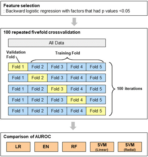Machine learning algorithms were developed to predict risk factors for BRONJ occurrence (Figure 1). Fivefold cross-validated multivariable logistic regression, elastic net, random forest (RF), and support vector machine (SVM) classification models were utilized. All the methods were implemented using the R package caret. For cross-validation, the dataset was randomly divided into five equal subsets. After partitioning one data sample into five subsets, we selected one subset for model validation, while the remaining subsets were used to establish machine learning models. Each cross-validation iteration was repeated 100 times to evaluate the power of the machine learning models. In elastic net, the gird-search value for λ and α, which controls the weight that is given to the penalty and the weight given to ridge or lasso penalty, respectively, was varied. In terms of RF, the mtry, the number of randomly selected predictors, was tested. For SVM, we used the linear and radial kernel functions, and the cost and sigma were optimized.