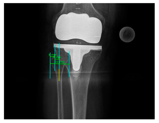 Radiographic analysis of the postoperative coronal leg alignment was executed using the mediCAD 2D planning software on postoperative coronal full-leg weight-bearing radiographs. The radiographs were first checked for eligibility according to the following quality criteria: missing postoperative pictures, minor quality with incomplete imaging of the operated leg or poor image quality, and excessive rotational error. For determination of the leg axis, the HKA was measured using the angle between the mechanical axis of the femur (FMA) and tibia (TMA) (Figure 1). The operation aimed to restore a neutral mechanical alignment (180° ± 3° varus/valgus). For further improvement of the measurement accuracy, we calculated rotational correction for the measured HKA using the formula published by Maderbacher et al. in 2014 and 2021 [10,11], which is based on the proximal tibio-fibular overlap in long leg radiographs measured via the mediCAD 2D planning software (Figure 2).