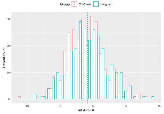 Total knee arthroplasty is a common and reliable procedure for successfully treating end-stage osteoarthritis (OA) of the knee. Although continued development of implant design, surgical technique, and postoperative follow-up treatment has improved the overall outcome of the procedure, there is still a noticeable number of patients who remain partially unsatisfied after TKA [1]. Amongst other factors, correct fitting and position of the TKA components with consecutive restoration of the axial alignment and mechanical axis of the limb lead to a good postoperative outcome and longer implant survival [2,3,4,5]. To maximize the capabilities of TKA regarding these factors, patient-specific customized implants have been developed in the recent past [6,7]. One of these implants is the patient-specific cruciate retaining knee replacement system iTotal™ CR G2 with custom-made implants and instruments, using computer-aided design and manufacturing (CAD/CAM) based on computed tomography (CT) scans of the patients’ leg. The goal of this implant is to restore a neutral postoperative mechanical axis, reduce bone resection, and optimize component fit. Previously published results are promising [8,9], although studies comparing CIM TKA to off-the-shelf implants implanted using conventional instrumentation are scarce, while most existing studies focus on patient-specific instrumentation rather than patient-specific implants. We therefore aimed to compare restoration of the hip–knee–ankle angle of the novel patient-specific knee replacement system iTotal CR G2 (ConforMIS Inc.; Burlington, MA, USA) to a matched cohort of the traditional knee replacement system Vanguard™ CR (Zimmer Biomet; Warsaw, IN, USA).