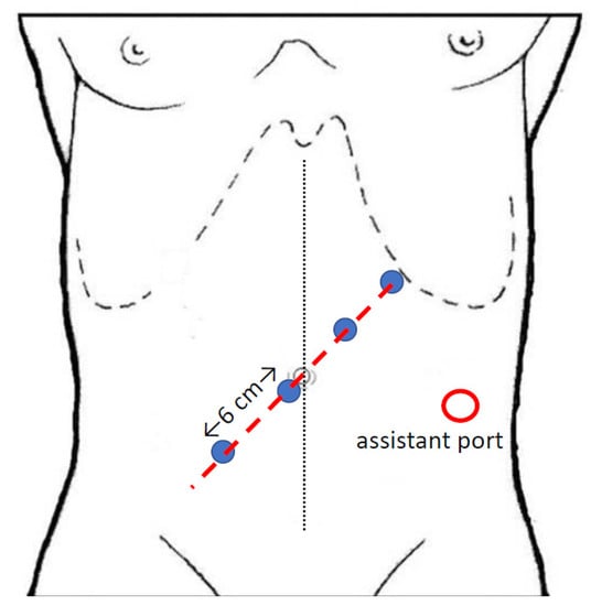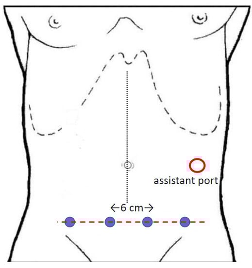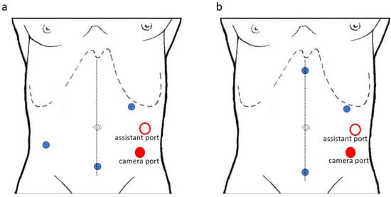 (a,b): trocars position for “medial-to-lateral” approach with the da Vinci Si® system.