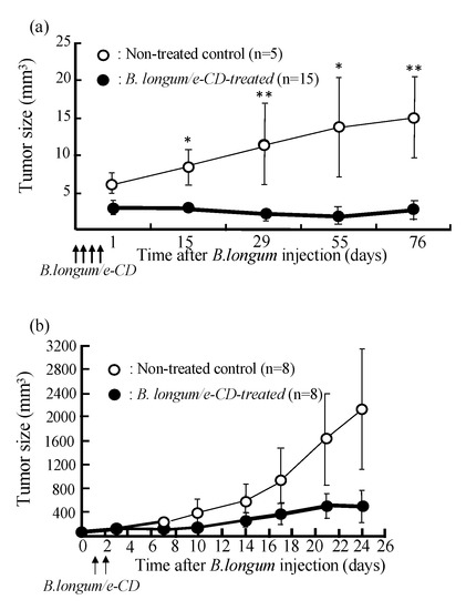 - Kimura, N.T.; Taniguchi, S.; Aoki, K.; Baba, T. Selective localization and growth of Bifidobacterium bifidum in mouse tumors following intravenous administration. Cancer Res. 1980, 40, 2061–2068. [Google Scholar] [PubMed]