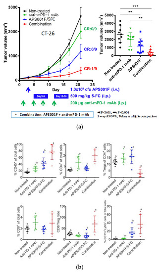 - Shioya, K.; Matsumura, T.; Seki, Y.; Shimizu, H.; Nakamura, T.; Taniguchi, S. Potentiated antitumor effects of APS001F/5-FC combined with anti-PD-1 antibody in a CT26 syngeneic mouse model. Biosci. Biotechnol. Biochem. 2021, 85, 324–331. [Google Scholar] [CrossRef]