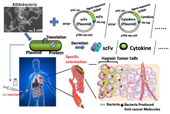 - Yazawa, K.; Fujimori, M.; Amano, J.; Kano, Y.; Taniguchi, S. Bifidobacterium longum as a delivery system for cancer gene therapy: Selective localization and growth in hypoxic tumors. Cancer Gene Ther. 2000, 7, 269–274. [Google Scholar] [CrossRef]