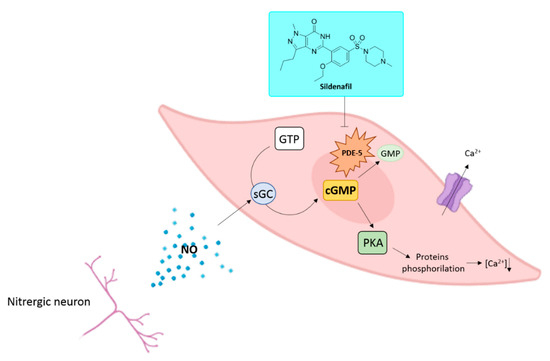 Nowadays, 11 PDE isoforms have been identified [3]. These isozymes share an aminoacidic homology superior to 65% and differ for their tissue distribution and affinity toward cAMP or cGMP; the latter is specifically degraded by PDE-5, -6, and -9 [4,5,6]. PDEs exert their catalytic activity as homodimers [7,8]. In each monomer, it is possible to highlight the presence of a zinc-binding motif, a catalytic binding pocket, two allosteric sites able to bind cAMP or cGMP, and a residue of serine in position 92 whose phosphorylation enhances the enzymatic activity through the activation of protein kinases A and G (PKA and PKG) [7,9]. PDEs regulate in an isoform-dependent manner different physiological roles such as platelet aggregation, inflammation, immune system activation, hormone secretion, vision, cardiac contractility, and muscle metabolism, smooth muscle contractility, depression, calcium intracellular concentration, cell proliferation, and penile erection [10]. The latter is an event that originates from the release of the gasotransmitter nitric oxide (NO) by nitrergic neurons and endothelial cells in case of sexual stimulation [11]. The physicochemical properties of NO allow it to diffuse into cells activating the enzyme soluble guanylyl cyclase (sGC) that in turn converts GTP into cGMP. In erectile tissues, cGMP triggers the phosphorylation of specific proteins involved in the modulation of the intracellular calcium ions concentration. A decreased concentration of calcium ions through the activation of Ca2+-ATPase dependent transporters and BKCa channels produces the vasodilation of blood vessels in the corpus cavernosum, leading to a penile erection [12]. cGMP binding to the allosteric sites of PDE-5 facilitates the binding of additional cGMP molecules to the active site of the enzyme and the consequent abolishment of cGMP activity (Figure 1) [9].