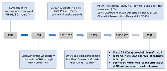 The uncovering of sildenafil properties by Pfizer researchers represented one of the most resounding examples of serendipity in the drug discovery field (Figure 3) [11,21]. As a matter of fact, the cardiovascular research group operating in Pfizer in 1989 was looking for new drugs exploitable for the treatment of angina pectoris, a pathological condition caused by a temporary spasm of the coronary arteries with the consequent reduction of oxygen flow into the heart tissue [22]. The first clinical trials highlighted that UK-92,480 (sildenafil investigational code) did not possess any advantage when compared with other drugs commonly used for the treatment of angina pectoris, such as nitrates [23]. Indeed, doses of UK-92,480 administered intravenously or orally ranging from 20 to 200 mg weakly modified the hemodynamic parameters and potentiated the effects of nitrates. In response to these findings, UK-92,480 seemed to be not effective for the goal of the study, and Pfizer researchers started to fear that the drug development of UK-92,480 could suffer a setback. Unexpectedly, among the limited number of side effects detected during these studies, penile erection resulted as the most surprising [24]. At the time of the research, ED was considered as a condition primarily originated by psychological disturbs and treated with invasive injections of vasodilating substances in the penile tissues [11]. Moreover, PDE-5 was known to be principally localized in platelets and vascular smooth muscle cells, whereas its localization in the erectile tissues was never properly investigated. A subsequent study brought to light the presence of this specific enzymatic isoform in erectile tissues [25], allowing a better comprehension of the physiological processes that regulate penile erection [26]. In addition, this discovery confirmed that ED could be treated with orally administrable PDE-5 inhibitors because of the specific expression of this isozyme in erectile tissues, paving the way for the potential placing on the market of a class of compounds exploitable for an unmet clinical need. After 21 separate additional clinical trials carried out from 1993 to 1996 performed on a total number of about 3000 men aged 19 to 87 years old [11], the efficacy and patient’s compliance of UK-92,480, later named as sildenafil, was definitely confirmed. These results determined UK-92,480 approval by the FDA in March 1998 in the United States and by the EMA in September 1998 [27] under the trade name of Viagra. The placing on the market of this drug represented a global market breakthrough for the treatment of ED, with more than USD 400 million earned only in 1998 and more than USD 1 billion.