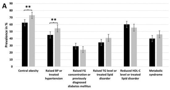 Significant differences were observed for the prevalence of central obesity (from 45.5% to 64.2%, p = 0.003) in the 20–34 age group, and for raised BP or treated hypertension (from 69.9% to 81.7%, p = 0.027) and reduced HDL-C levels or treated lipid disorder (from 66.4% to 50.8%, p = 0.010) in the 50–64 age group with opposite directions. The other parameters did not differ significantly between the studied populations. For more details, see Figure 2.