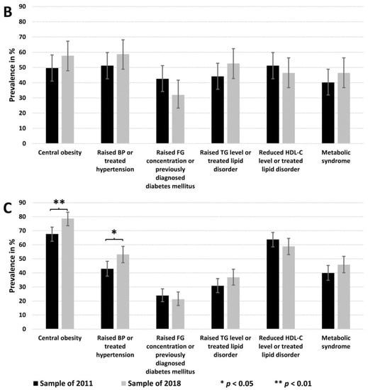 Prevalence of metabolic syndrome and its components among Roma of Northeast Hungary in 2011 and 2018 ((A) in the populations studied, (B) in males, and (C) in females). BP: blood pressure; FG: fasting plasma glucose; TG: triglyceride; HDL-C: high-density lipoprotein cholesterol.
