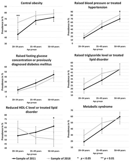 An increase in the prevalence of metabolic syndrome was observed in case of the 20–34 and 35–49 age groups between 2011 and 2018, but it was not statistically significant.