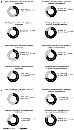 We examined how the prevalence of individuals not treated for the four treatable components of MetS (listed above) changed in the study populations by sex between 2011 and 2018. The prevalence of untreated individuals with raised FG concentration and/or T2DM significantly decreased (from 76.7% in 2011 to 53.3% in 2018, p < 0.001). Contrarily, there was an almost statistically significant increase in the prevalence of untreated individuals with raised blood pressure and/or previously diagnosed hypertension (from 32.9% in 2011 to 42.2% in 2018, p = 0.051), and there was no significant change in the prevalence of untreated individuals with raised TG levels between 2011 and 2018 (from 67.7% to 73.9%, p = 0.235).